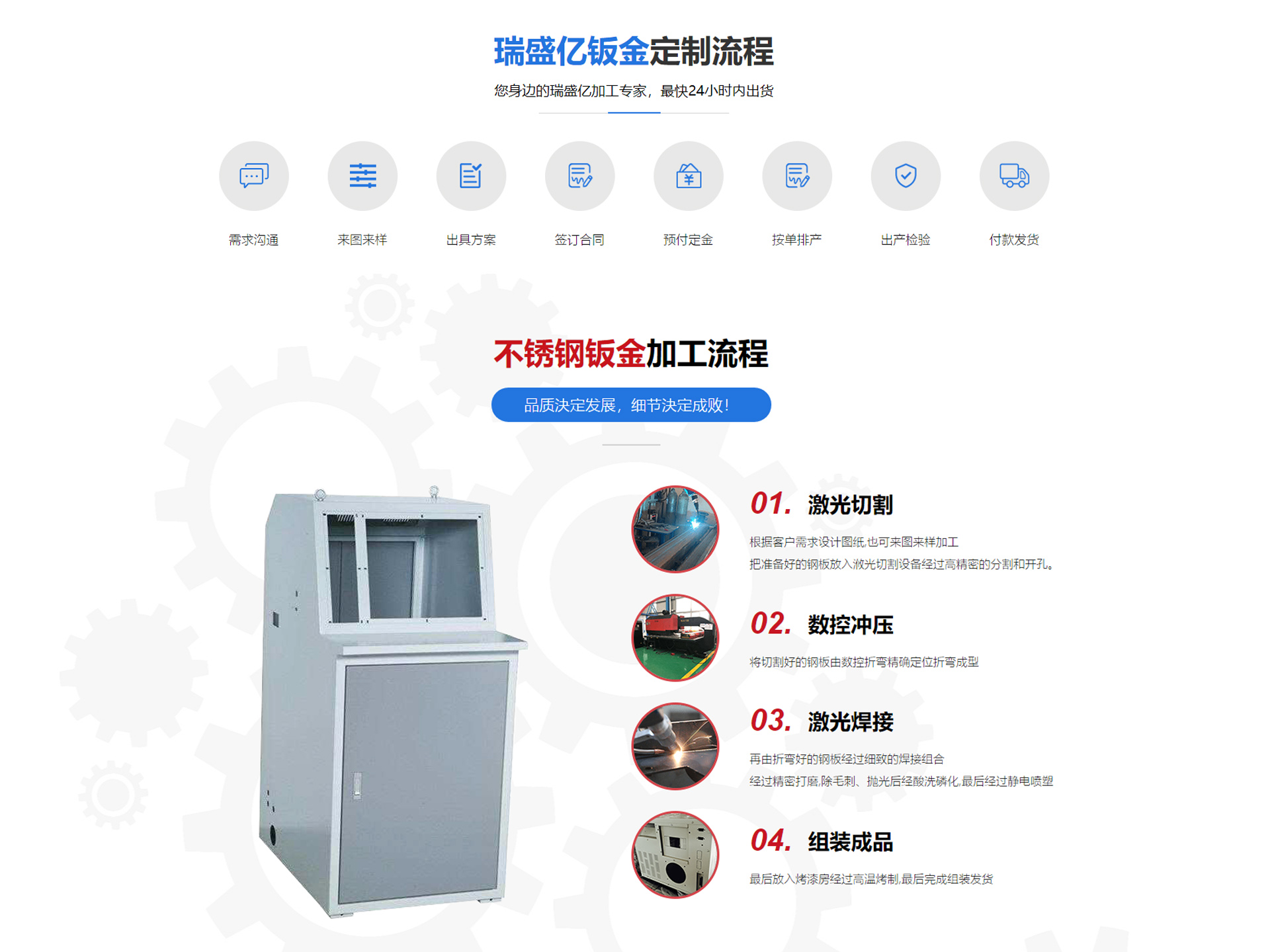 瑞盛億金屬制品(廈門)有限公司是由原廈門市鼎利達工貿有限公司(行業20年經驗)基礎上(管理團隊,骨干員工均不變)新成立的一家專門從事精密鈑金生產的企業,公司主營:鈑金、機柜箱、設備機架、不銹鋼制品等。本公司將以誠信、專注、品質及時為客戶創造更具價值的產品,為客戶創造價值,贏得客戶的信任和支持,讓客戶和員工滿意是本公司可持續發展的根本保證,我們將秉承這一理念貫穿整個生產、經營活動中,保持與客戶長期、持續的合作。